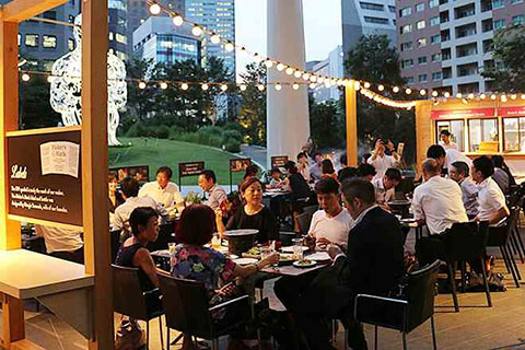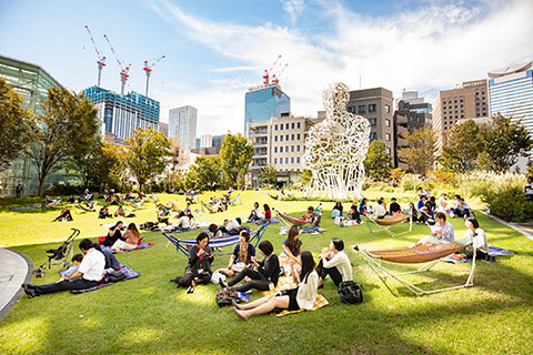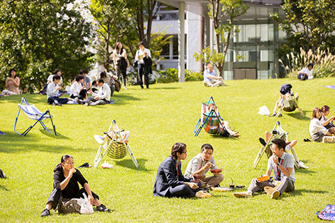 オーバル広場の芝生を前にした緑豊かな空間で、都会のアウトドア気分を満喫していただきました。