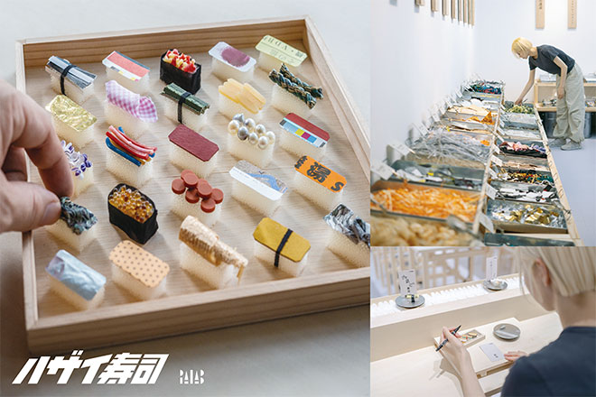 工場から生まれるハザイ(端材)には、独自の表情や触感、謎の文字や記号があります。それらの“ネタ”を厳選し、“シャリ”に見立てたスポンジと組み合わせて「ハザイ寿司」が制作できる体験を提供します。制作したハザイ寿司をレールに流す回転寿司の場を通して、参加者同士の相互関係に基づく新たな価値を生み出す体験型インスタレーションです。