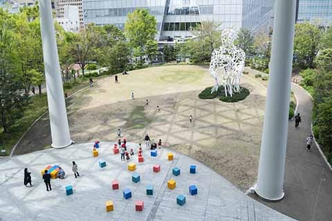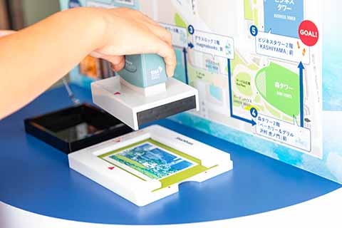 虎ノ門ヒルズ内の5か所にスタンプを設置し、スタンプを重ねて押すと、オーバル広場の景色が完成します。