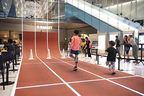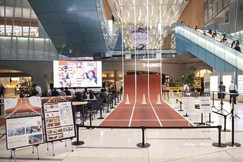 パブリックビューイングを実施。大きく盛り上がりを見せました。また、会場内には、全長15mの陸上トラックが登場し、体験者の400cM走の動きに合わせ、トラックのラインが光る体験ブースや、やり投げ、砲丸投げの球など実際に競技で使用されているアイテムの展示など、競技を身近に感じていただくことができました。